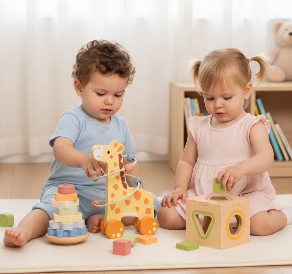 Set educativo 3 en 1 de jirafa de madera para niños y niñas que incluye actividades de encaje, apilado y laberinto. Ideal desde los 12 meses para trabajar, motricidad fina, concentración y juego imaginativo, con entrega inmediata en Panamá.