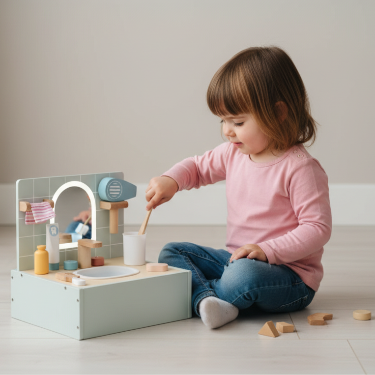 💄 Tocador de madera con espejo y accesorios, ideal para juegos de imitación. Fomenta la creatividad, la imaginación y la coordinación mientras los niños se divierten jugando a arreglarse como los grandes.